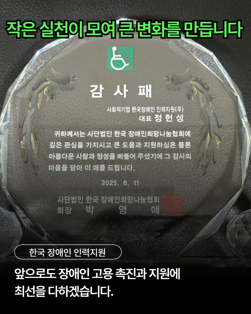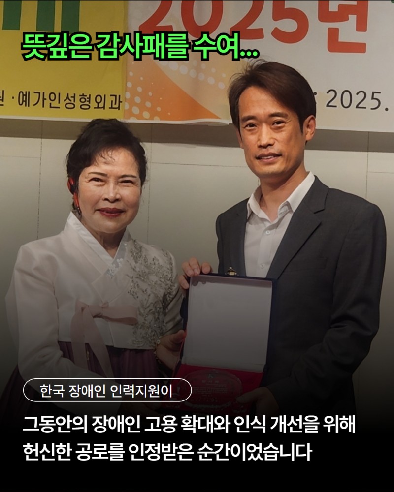 공지사항 [감사패 수상] 2025년, 따뜻한 나눔의 마음을 기억합니다 페이지 정보 작성자 관리자 조회 163회 작성일 25-06-17 14:35 목록 본문 이전글2025년 기업체장애인고용실태조사 25.06.29 다음글장애인 고용! 편견이 아닌 가능성으로! 25.05.29