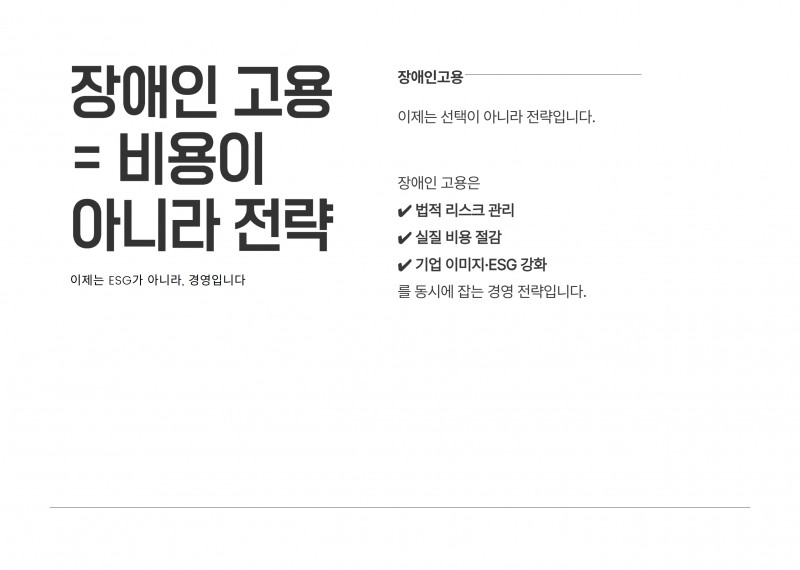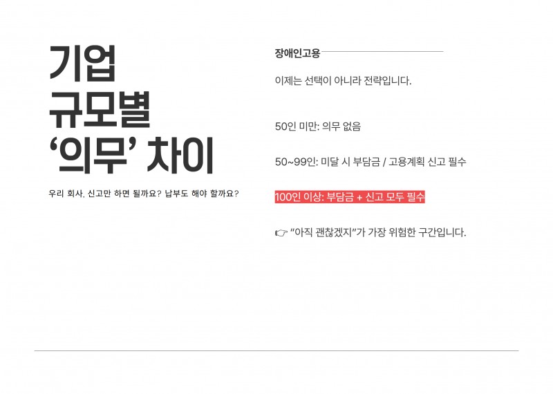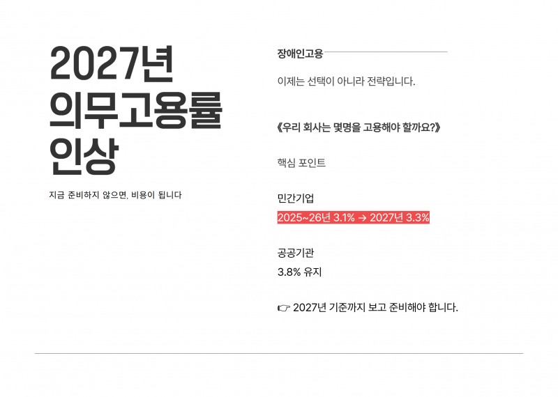 새소식 2027년 의무고용률 인상 대비, 지금이 장애인 채용을 준비할 타이밍입니다 페이지 정보 작성자 관리자 조회 74회 작성일 26-01-15 10:21 목록 본문 이전글중증 장애인 돌봄 공백 해소 요구… 국회 국민동의청원 진행 26.03.07 다음글2025년 장애인 고용현황 정리: 인사담당자를 위한 실무 포인트 25.12.01